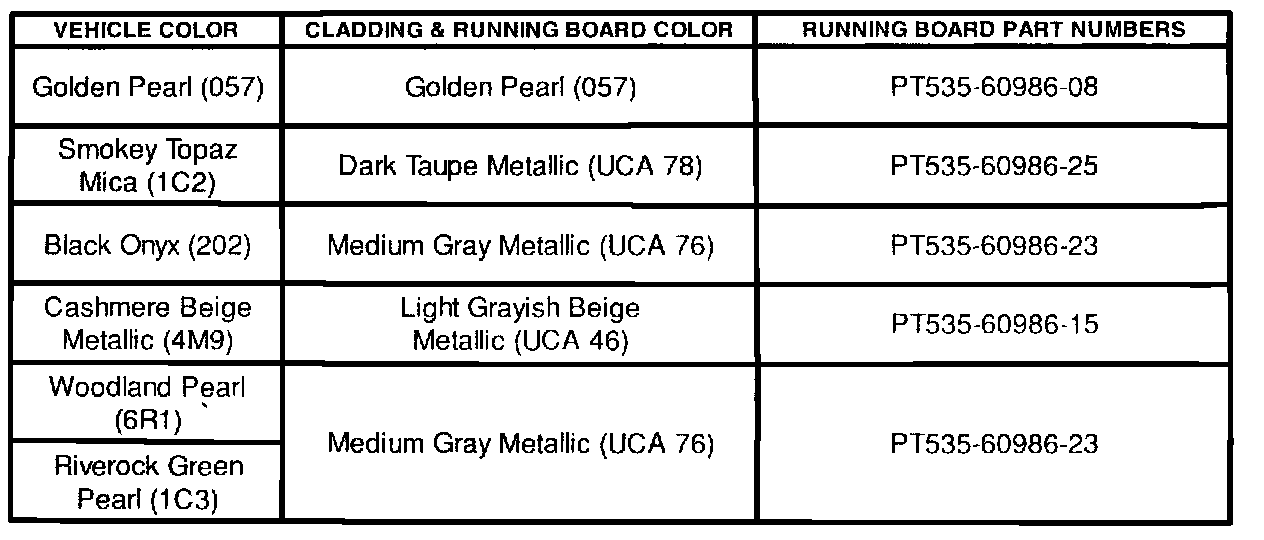 The LX 470 running board is installed on 100% of the vehicles at the vehicle distribution center (VDC). Attached are the installation instructions for the LX 470 running board. These instructions will make dealers aware of proper installation techniques when installing the following replacement parts: