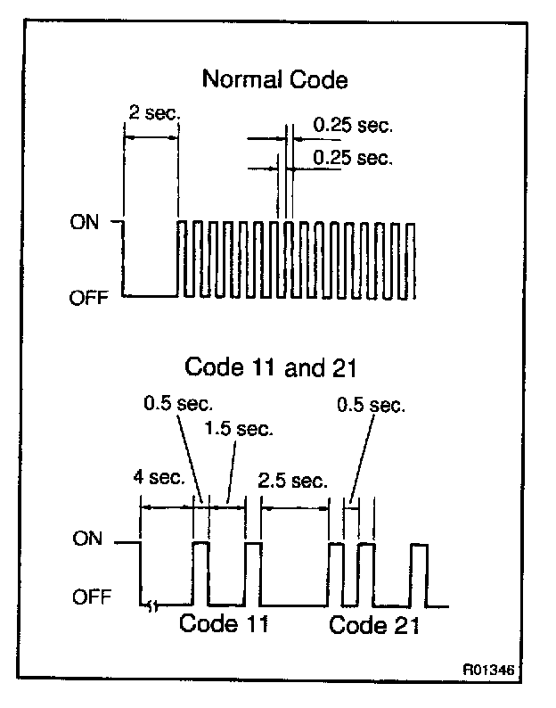 - As an example, the blinking patterns for normal code and codes 11 and 21 are shown on the left.