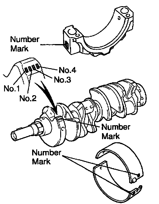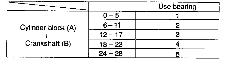 HINT: If using a standard bearing, replace it with one having the same number. If the number of the bearing cannot be determined, select the correct bearing by adding together the numbers imprinted on the cylinder block and crankshaft' then refer to the table for the appropriate bearing number. There are 5 sizes of the standard bearings. For No.1 and No.5 position bearings, use bearings marked "3", "4", "5", "6" and "7". For others position bearings, use bearings marked "1", "2", "3", "4" and "5".