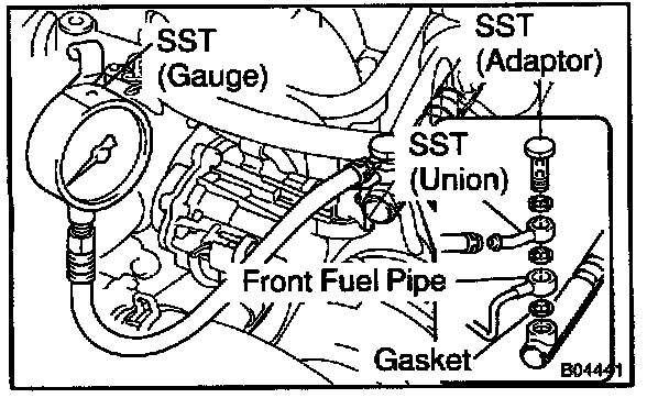 d. Install the front fuel pipe and SST (pressure gauge) to the delivery pipe with 3 lower gaskets and SST (adaptor).