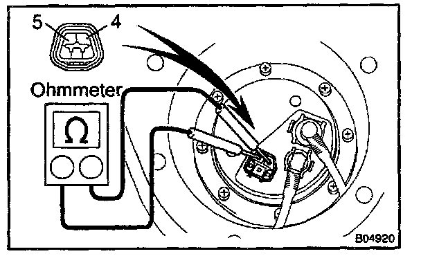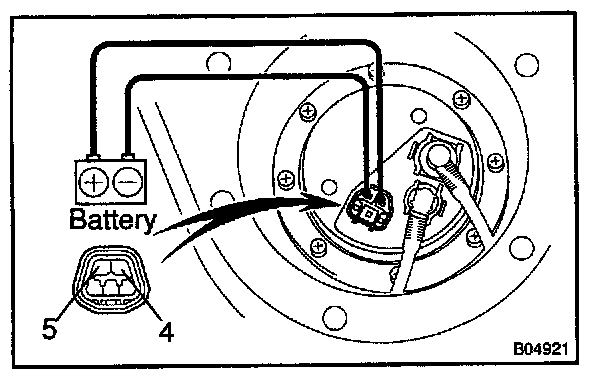 Connect the positive (+) lead from the battery to terminal 4 of the connector, and the negative (-) lead to terminal 5. Check that the fuel pump operates.