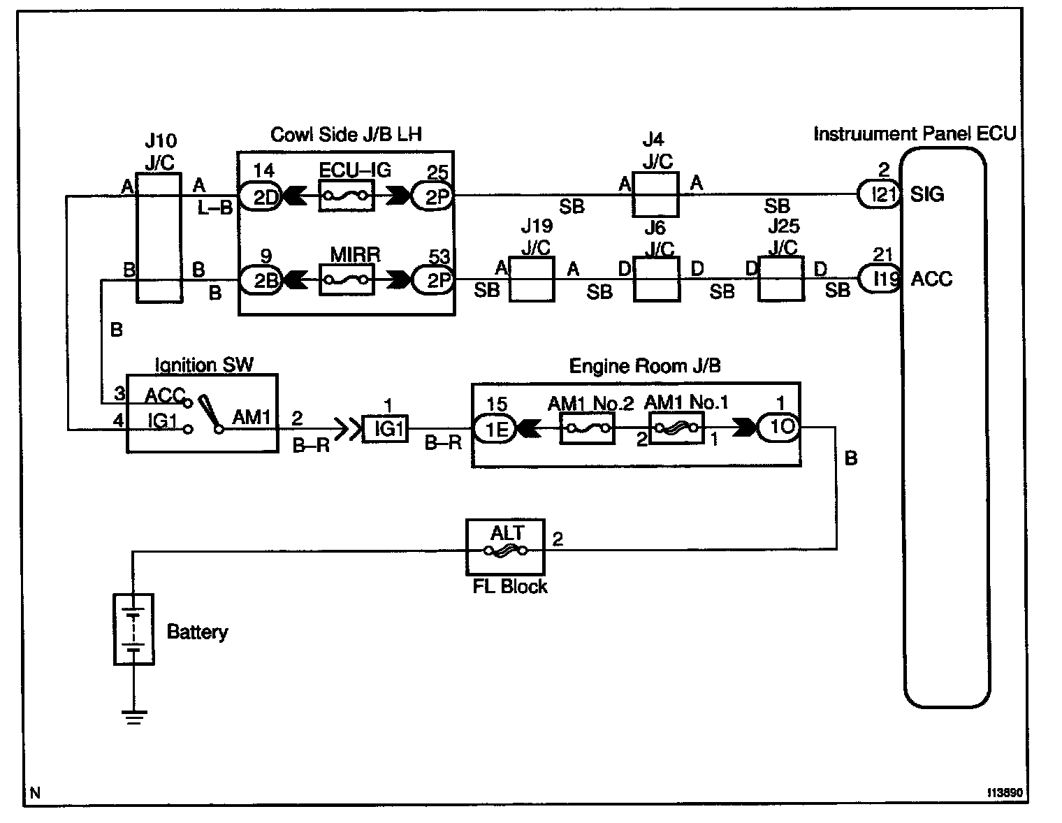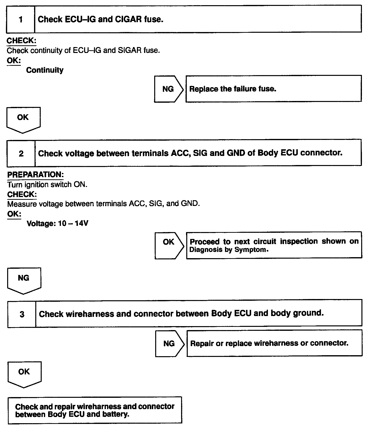 CIRCUIT DESCRIPTIONWhen the ignition switch is turned to the ACC position, battery positive voltage is applied to the terminal ACC of the ECU and when the ignition switch is turned to the ON position, battery positive voltage is applied to the terminal SIG of the ECU.