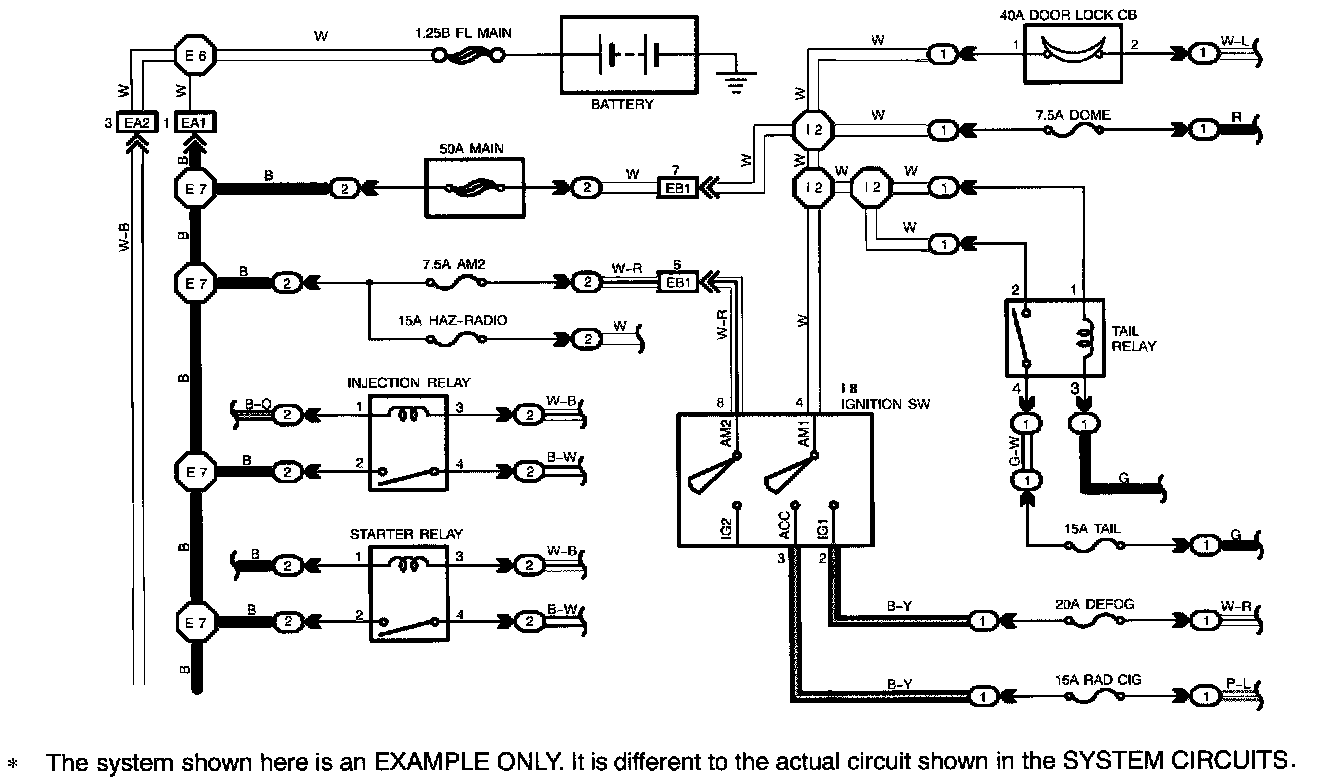 The chart shows the route by which current flows from the battery to each electrical source (Fusible Link, Circuit Breaker, Fuse, etc.) and other parts.