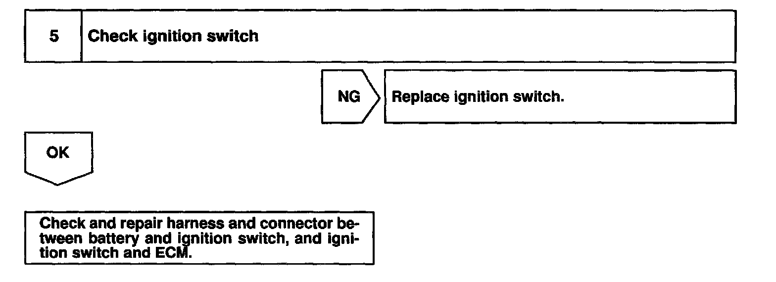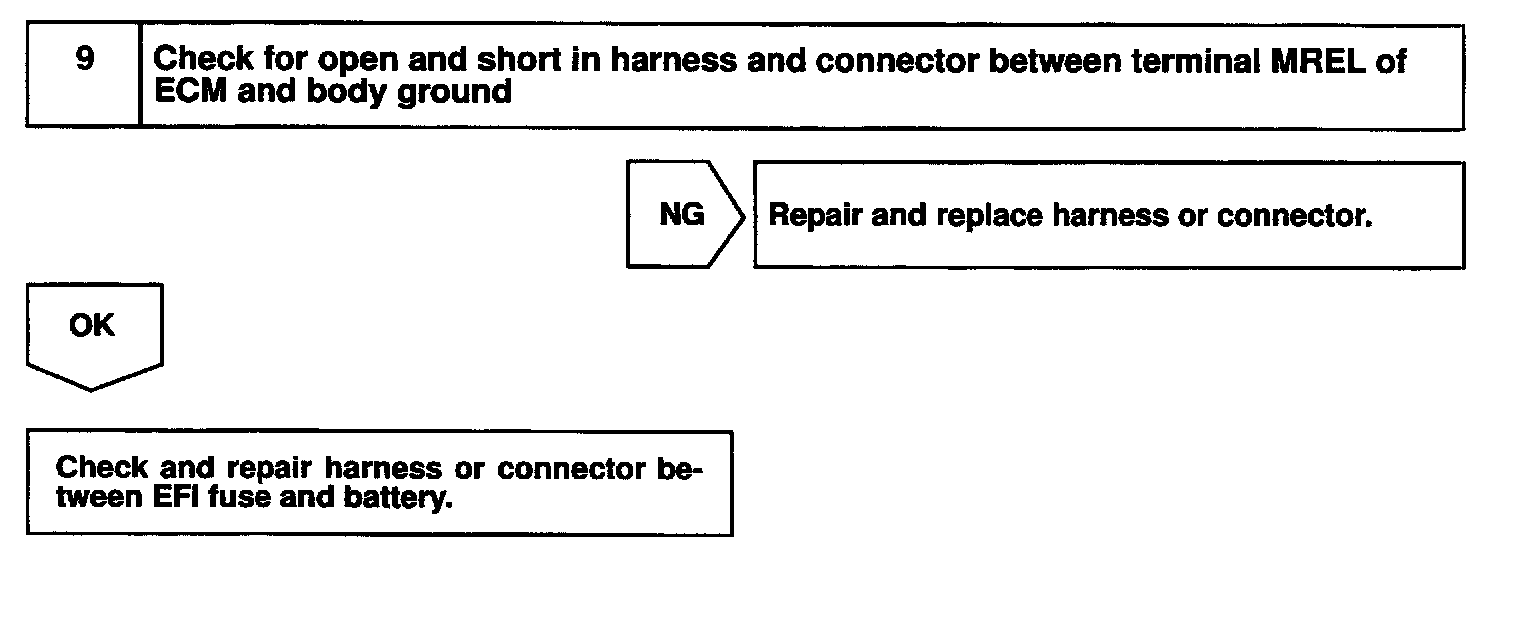 CIRCUIT DESCRIPTIONWhen the ignition switch is turned ON, battery positive voltage is applied to terminal IGSW of the ECM and the EFI main relay (Marking: EFI) control circuit in the ECM sends a signal to terminal MREL of the ECM switching on the EFI main relay.