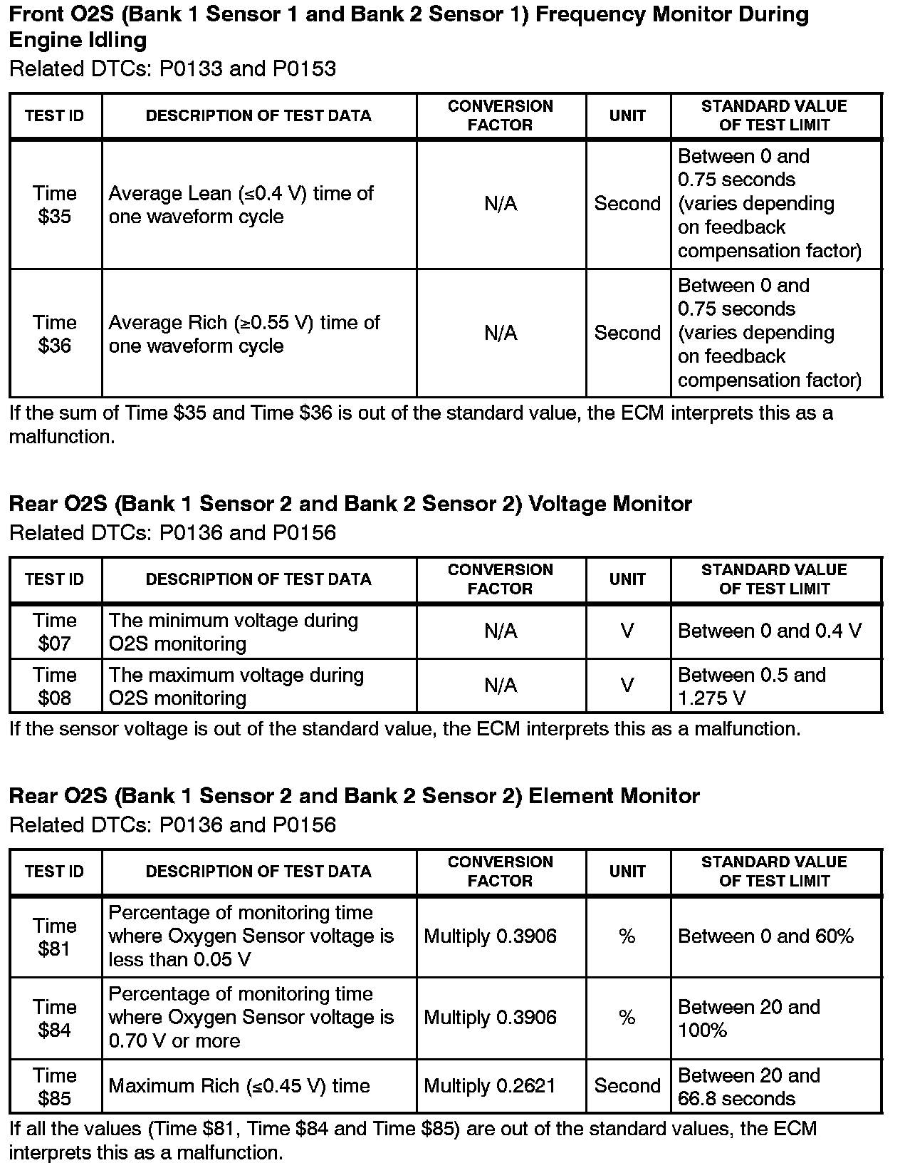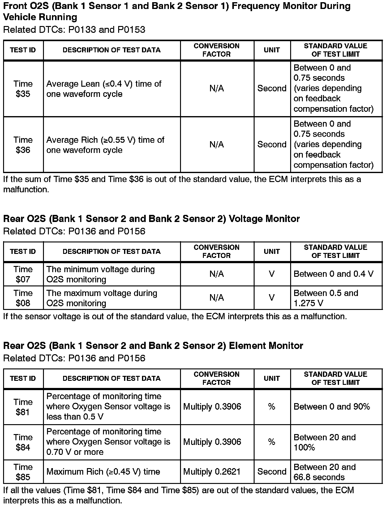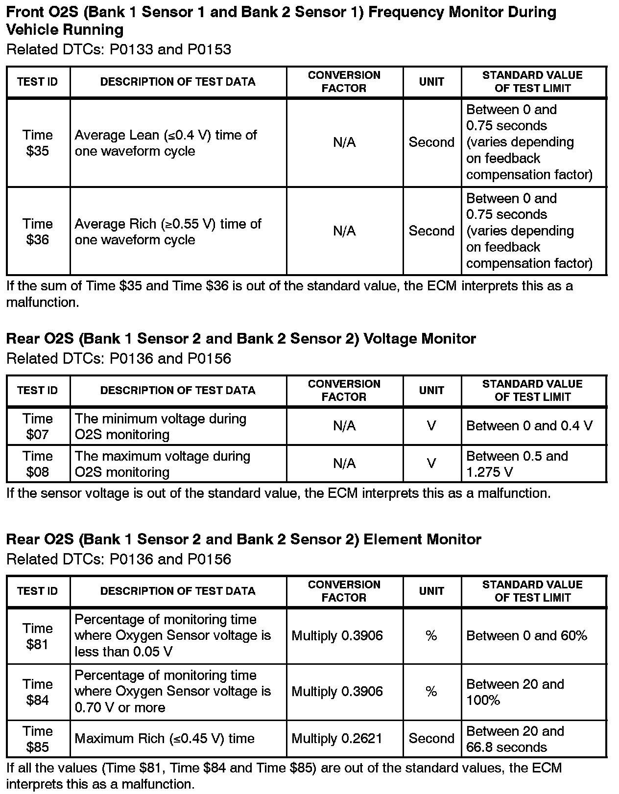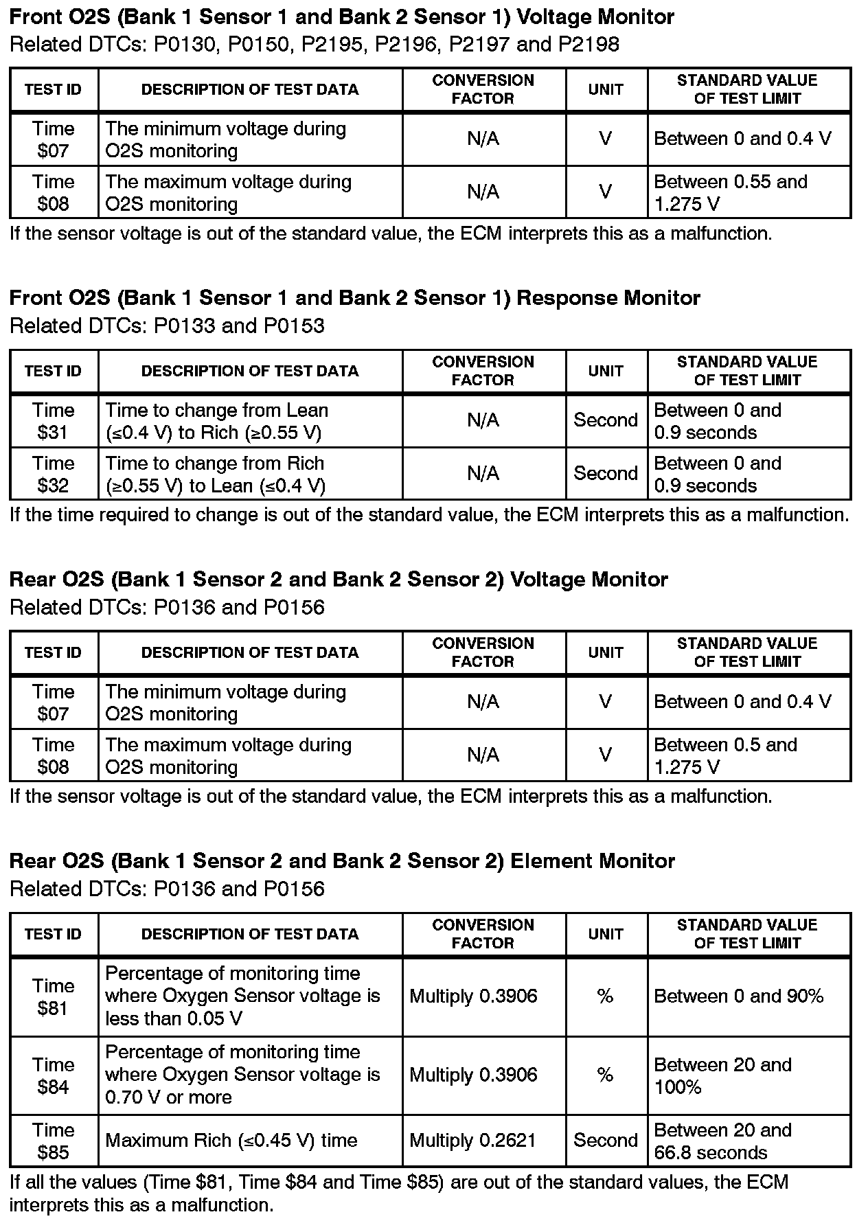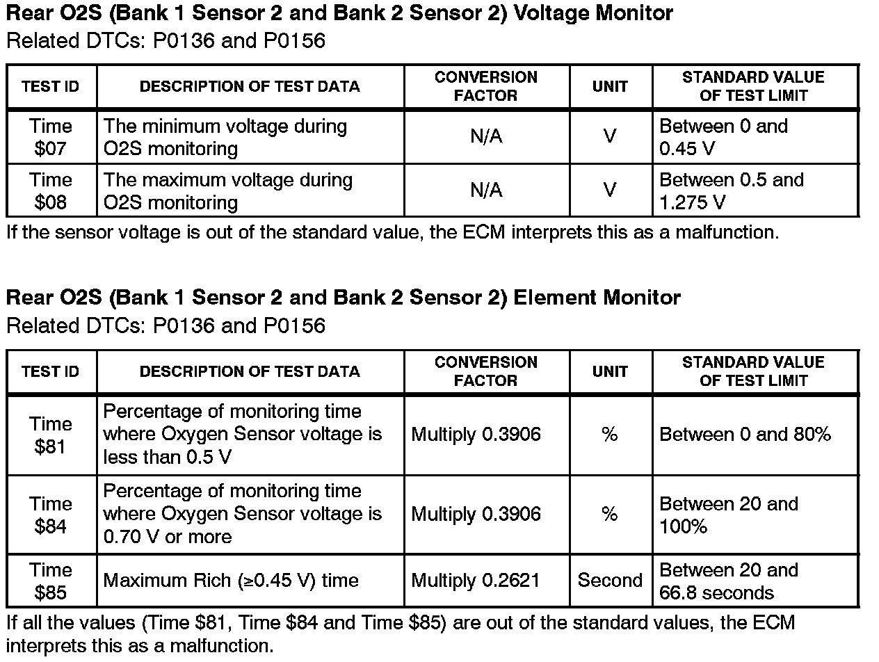 This Service Bulletin contains Oxygen Sensor (O2S) Monitor threshold values for all models from 1996 to 2003 and some 2004 models. Starting in 2004, the O2S Monitor threshold values can be found in the repair manual. These values are used when analyzing the 02S test results to determine the O2S condition.