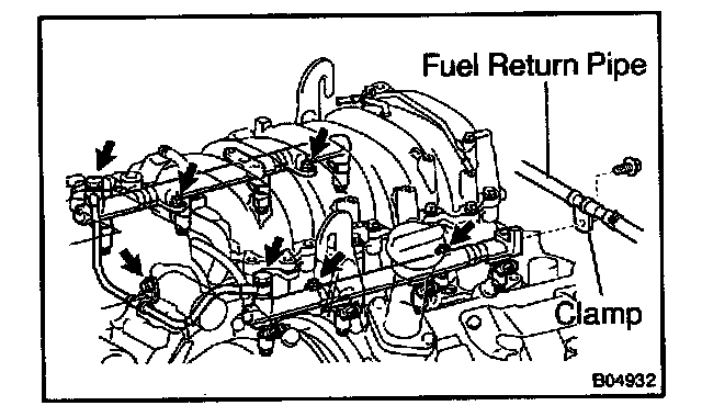 i. Install the bolt holding the clamp on the fuel return pipe to the LH delivery pipe.