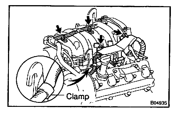 Disconnect the 2 wire clamps on the engine wire from the brackets on the delivery pipe