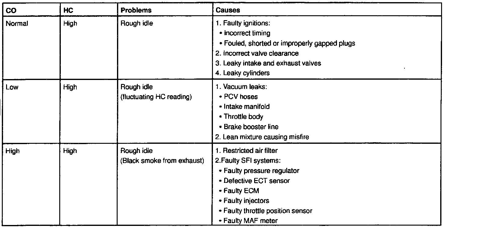 If the CO/HC concentration does not comply with regulations, perform troubleshooting in the order given. See the table for possible causes, and then inspect and correct the applicable causes if necessary.