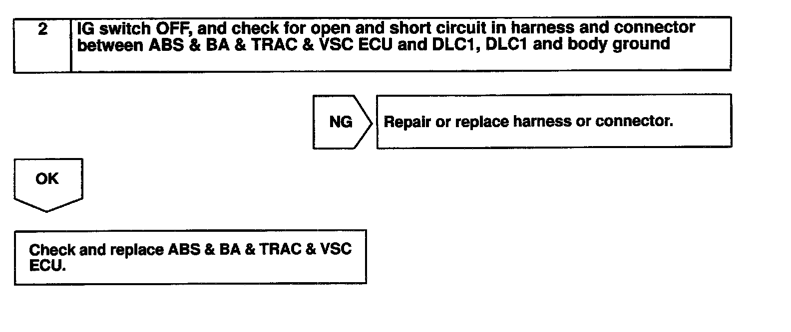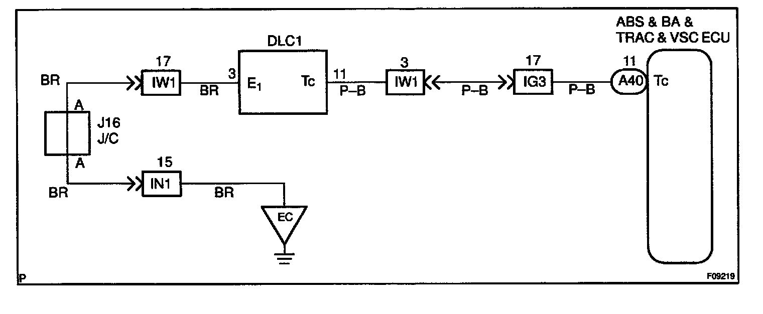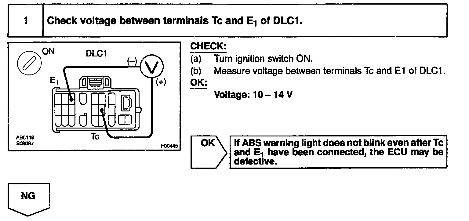 Connecting terminals Tc and E1 of the DLC1 causes the ECU to display the DTC by flashing the ABS warning light and VSC TRAC warning light.