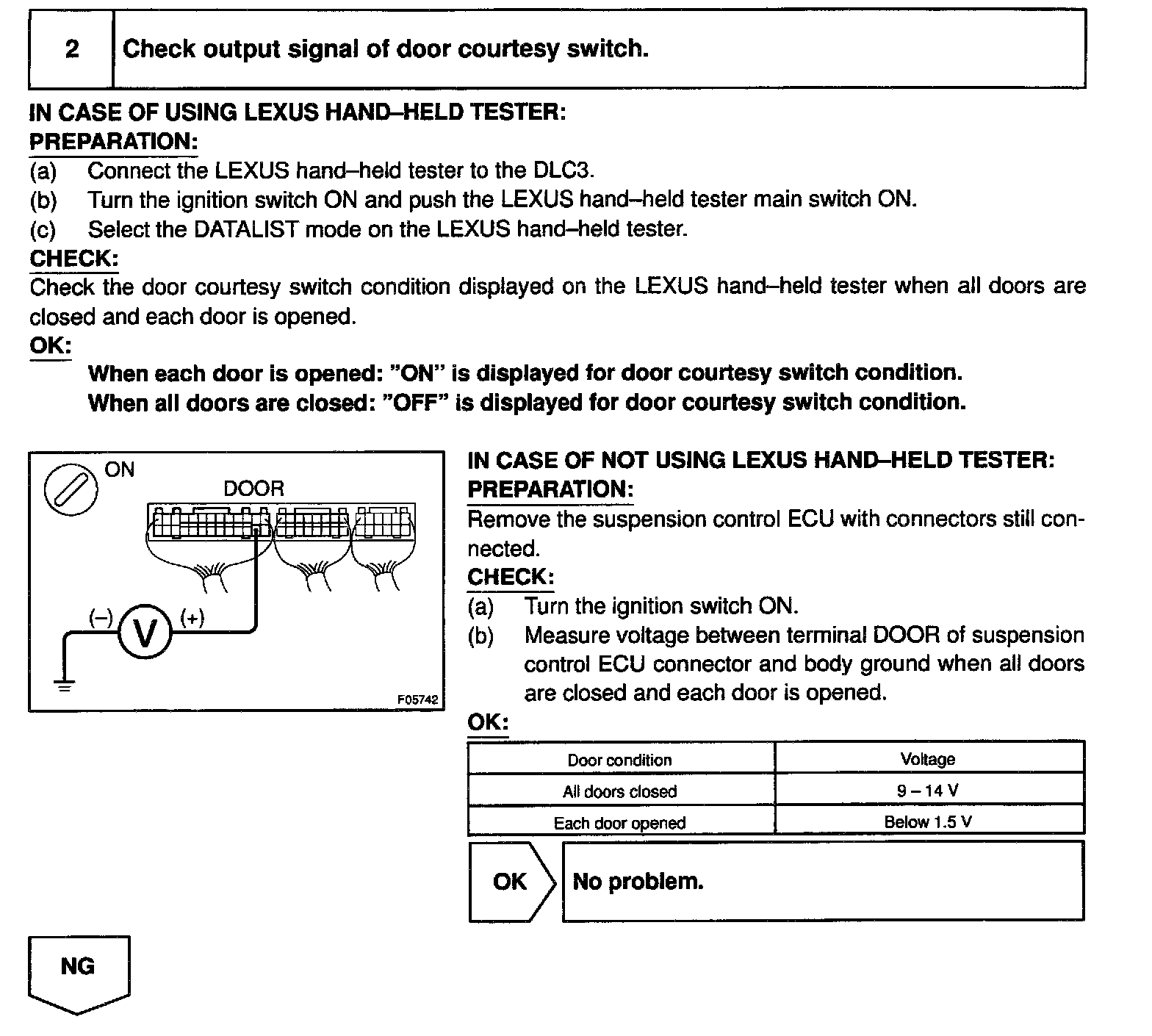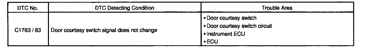 CIRCUIT DESCRIPTIONThe door courtesy switch comes on when the door is opened and goes off when the door is closed. Therefore, battery positive voltage is applied to the terminal DOOR of the ECU when all the doors are closed and 0 V is applied when even one door is opened.