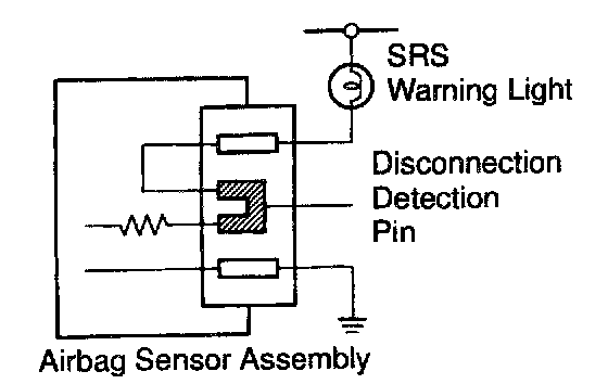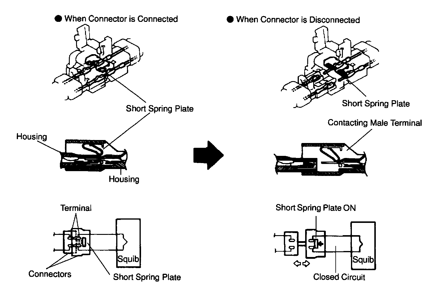 Each connector contains a short spring plate. When the connector is disconnected, positive (+) terminal and negative (-) terminal of the squib are attached.
