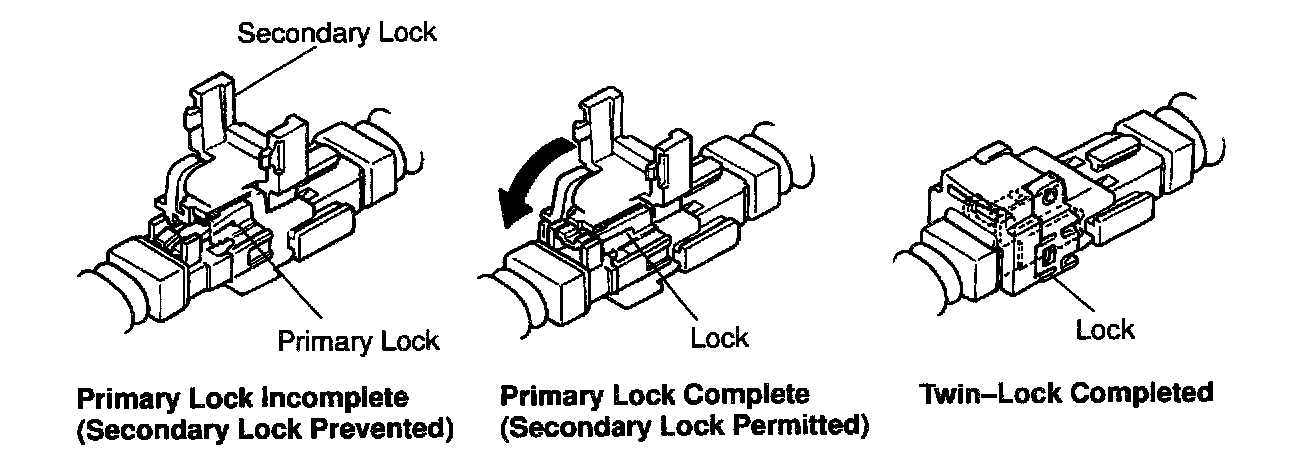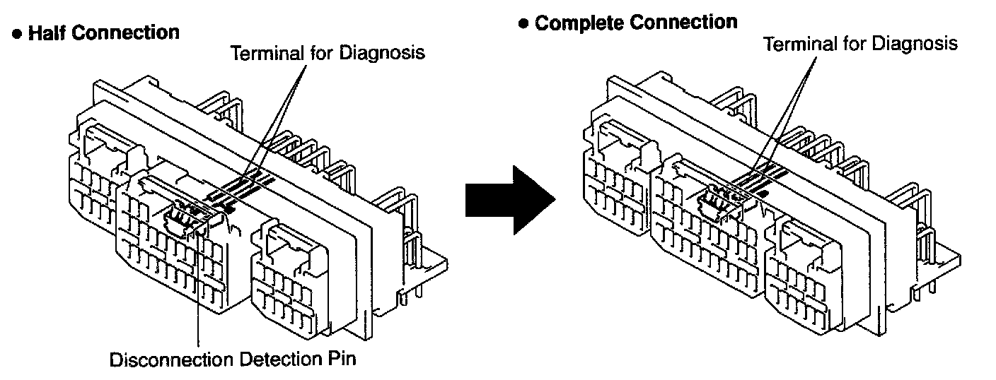 This mechanism is designed to electrically check if connectors are connected correctly and completely. The electrical connection check mechanism is designed so that the connection detection pin connects with the diagnosis terminals when the connector housing lock is in the locked condition.