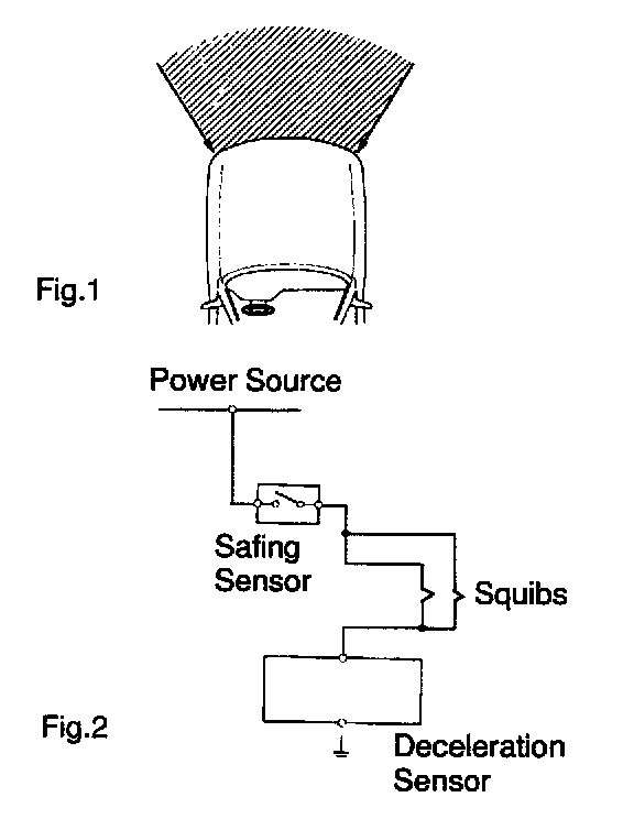A safing sensor is designed to go ON at a smaller deceleration rate than the airbag sensors. As illustrated in Fig.2, ignition is caused when a safing sensor and the deceleration sensor go ON simultaneously.