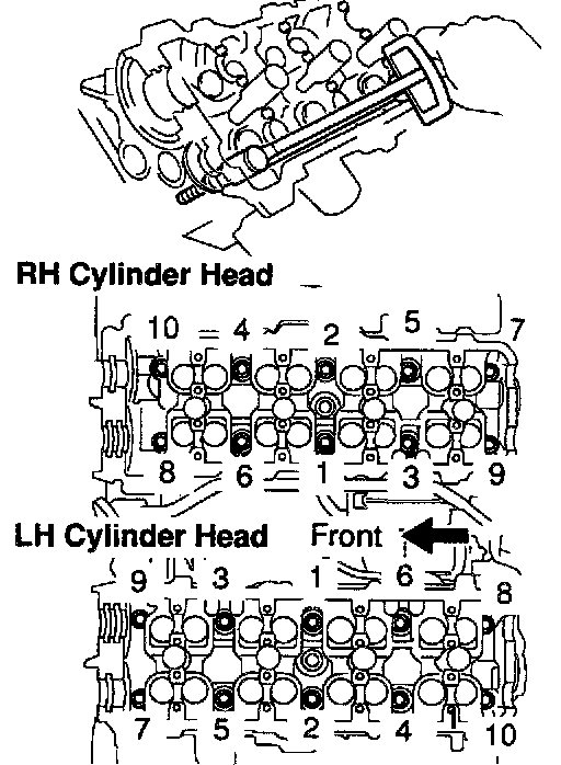 c. Install and uniformly tighten the 10 cylinder head bolts on one side of the cylinder head in several passes in the sequence shown, then do the other side as shown.
