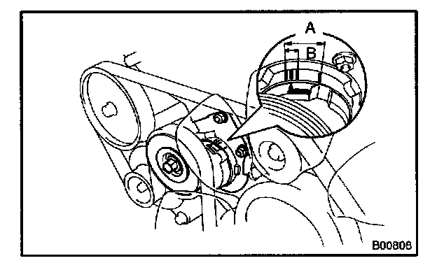 - Check that the arrow mark on the belt tensioner falls within area A of the scale.
