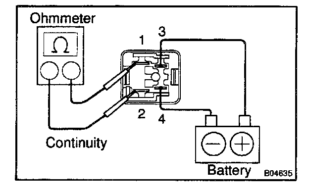 a. Using an ohmmeter, check that there is continuity between terminals 3 and 4. If there is no continuity, replace the relay.