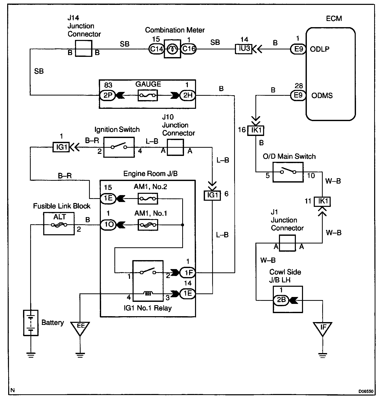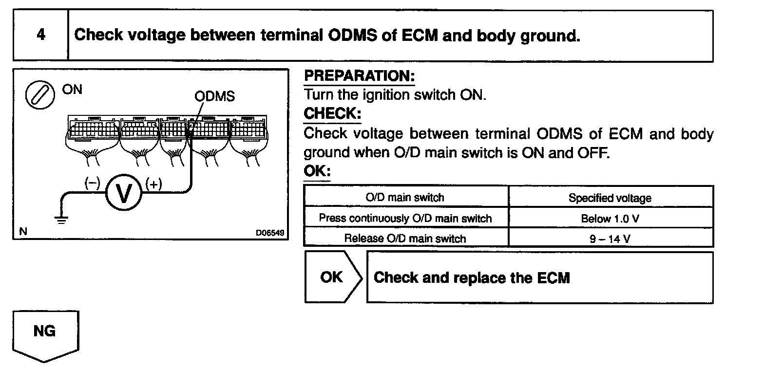 CIRCUIT DESCRIPTIONThe O/D main switch is a momentary type switch. When pressing the O/D OFF main switch, the O/D OFF indicator light lights up and ECM prohibits shifting to O/D, and when pressing it again, the O/D OFF indicator light goes off and ECM allows shifting to O/D. Turning the IG switch OFF will reset the O/D OFF indicator light.
