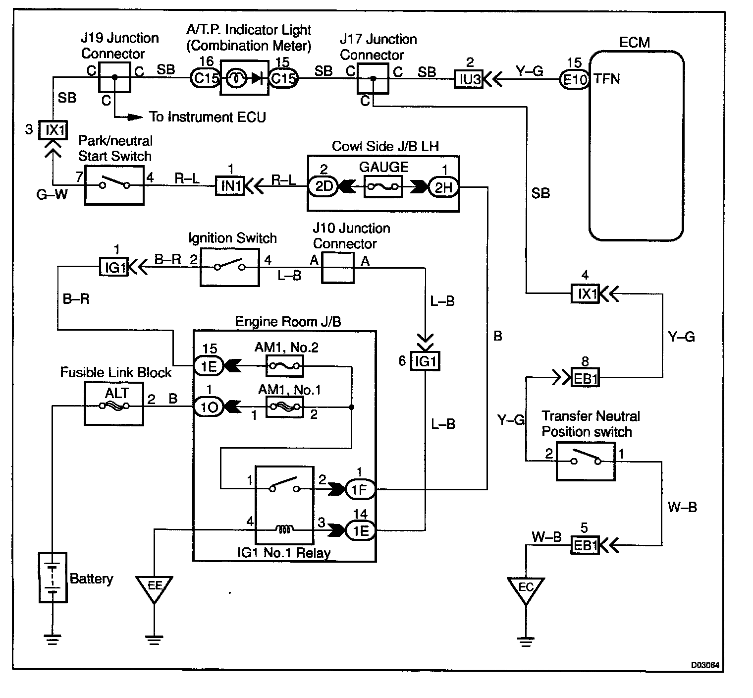 CIRCUIT DESCRIPTIONThe propeller shaft and wheels are free even when the transmission shift lever is set to P as long as the transfer shift lever is in Neutral position. The A/T.P. indicator light lights up to warn the driver that the propeller shaft and wheels are not locked.