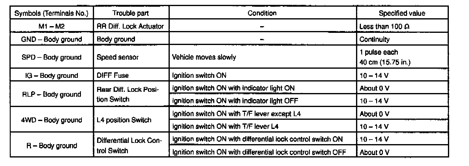 Disconnect the connector from the rear diff. lock control ECU and inspect the connector on the wire harness side, as shown in the table.