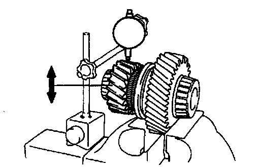 b. Using a dial indicator, measure the idler low gear radial clearance.