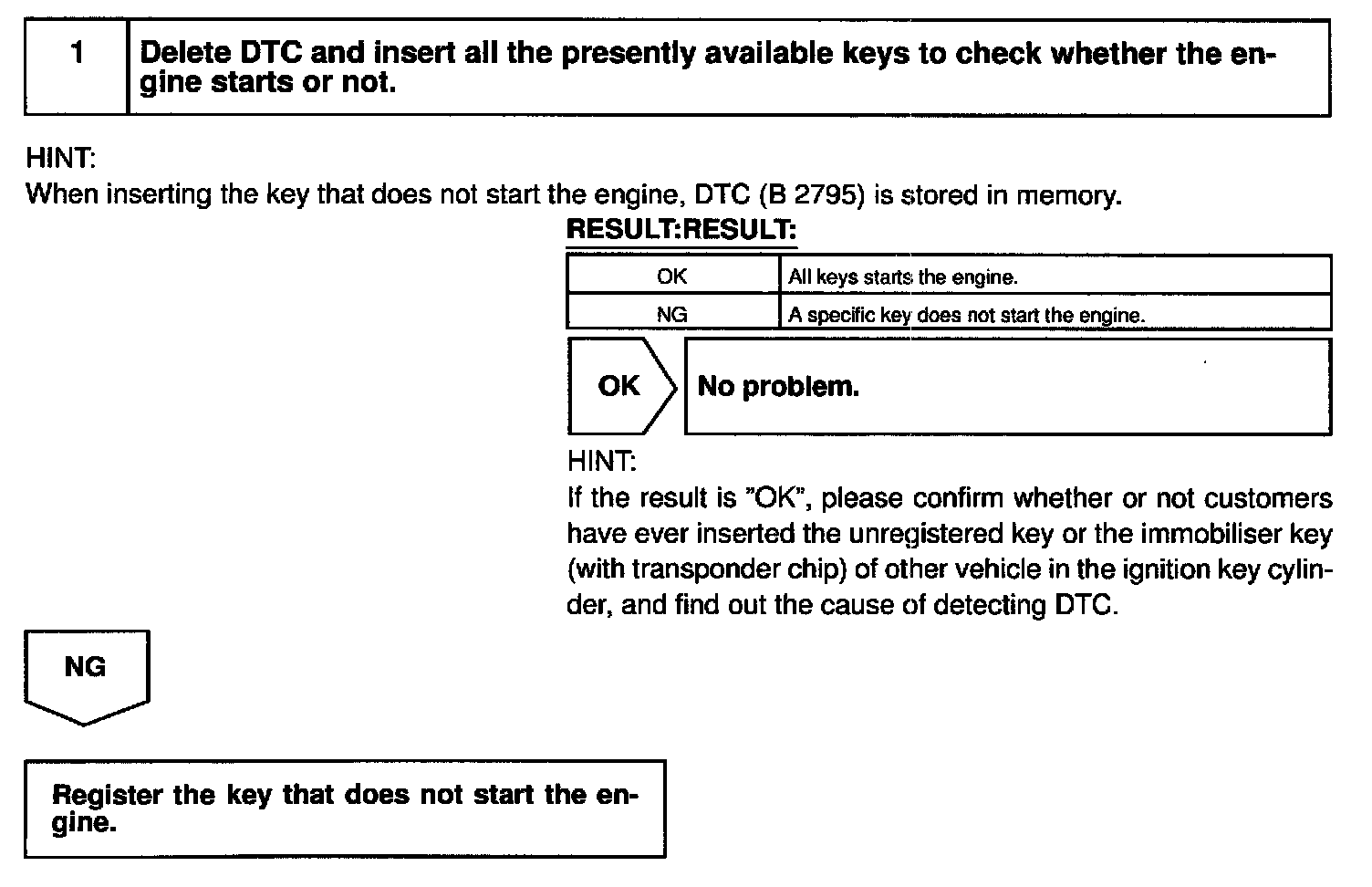 When a key that outputs B2795 is found, register this key, when B2795 is not output, there is a possibility that the unregistered key has been inserted before. (ECM is normal.)