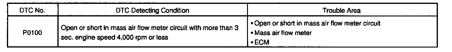 If the ECM detects DTC P0100 it operates the fail-safe function, keeping the ignition timing and injection volume constantly and making it possible to drive the vehicle.