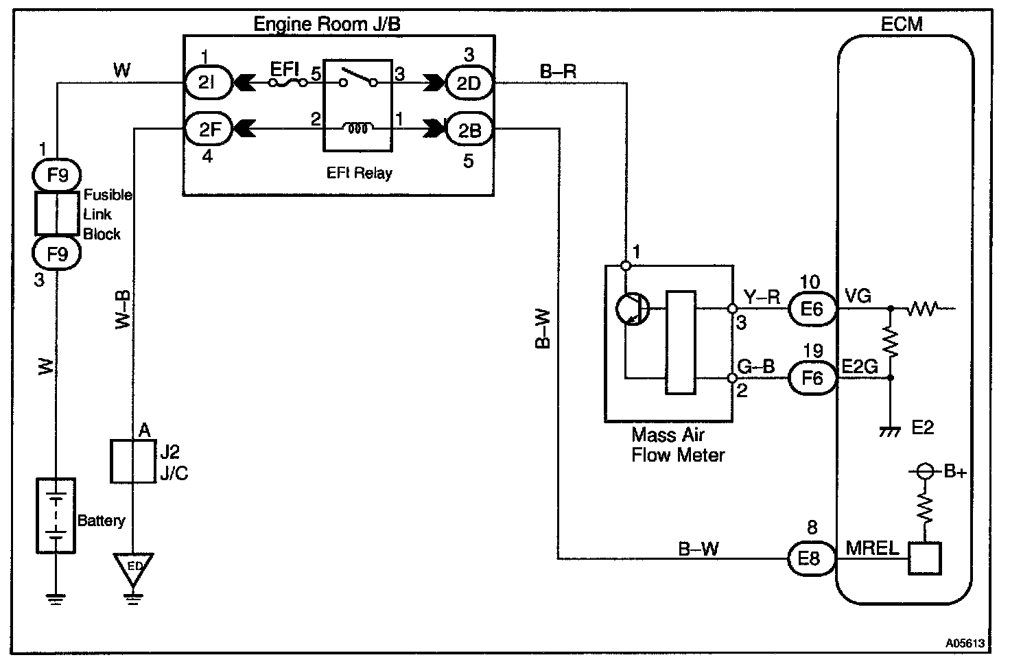 The mass air flow meter uses a platinum hot wire. The hot wire air flow meter consists of a platinum hot wire, thermistor and a control circuit installed in a plastic housing. The hot wire air flow meter works on the principle that the hot wire and thermistor located in the intake air bypass of the housing detect any changes in the intake air temperature.