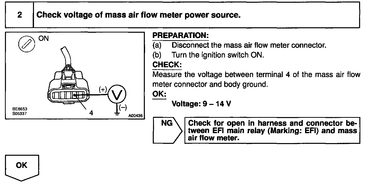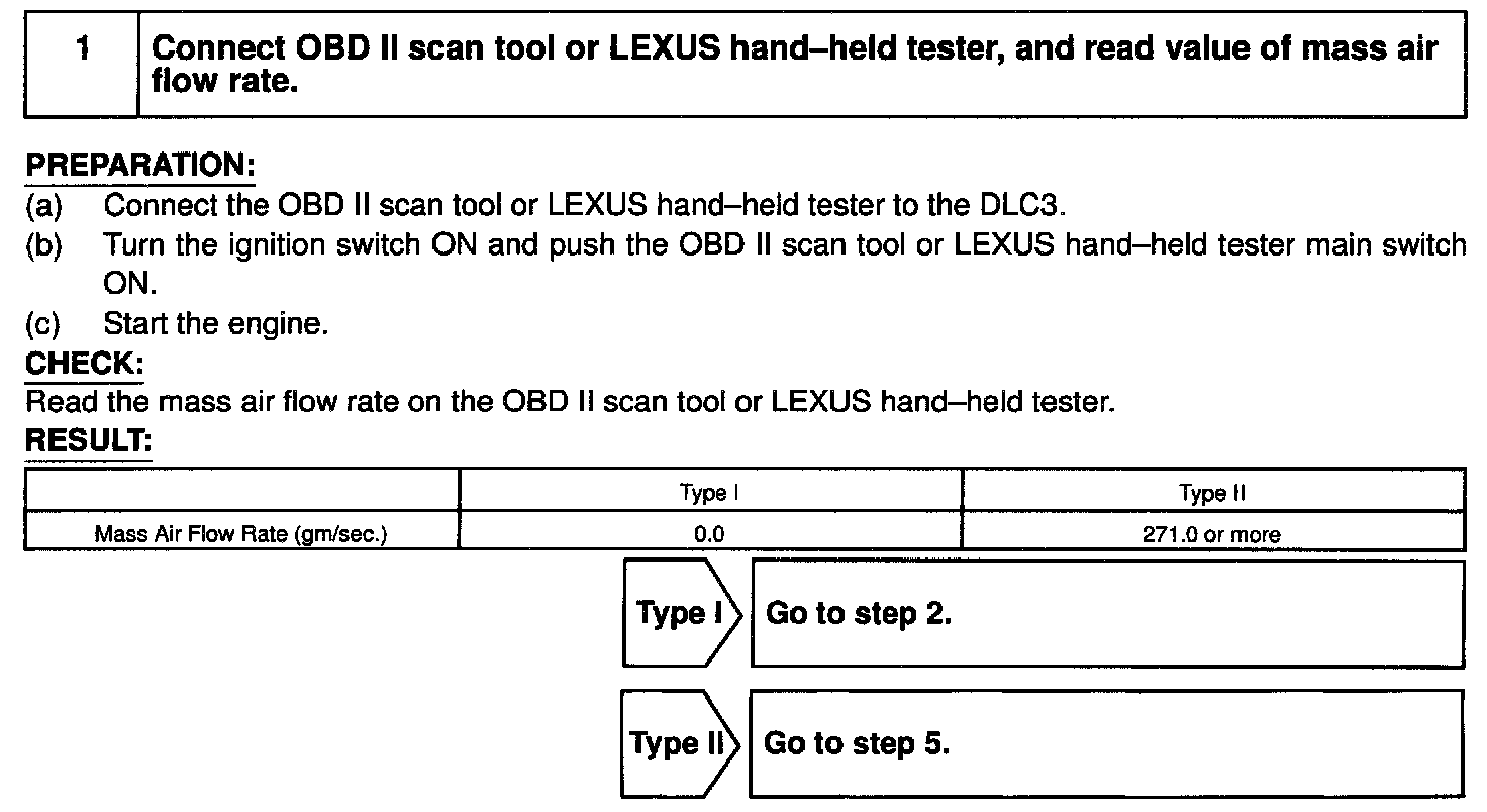 HINT: After confirming DTC P0100, use the OBD II scan tool or LEXUS hand-held tester to confirm the mass air flow ratio from the CURRENT DATA.
