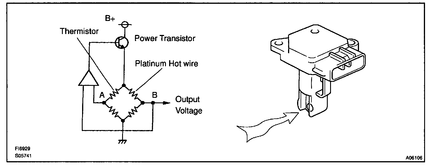The mass air flow meter uses a platinum hot wire. The hot wire air flow meter consists of a platinum hot wire, thermistor and a control circuit installed in a plastic housing. The hot wire air flow meter works on the principle that the hot wire and thermistor located in the intake air bypass of the housing detect any changes in the intake air temperature.
