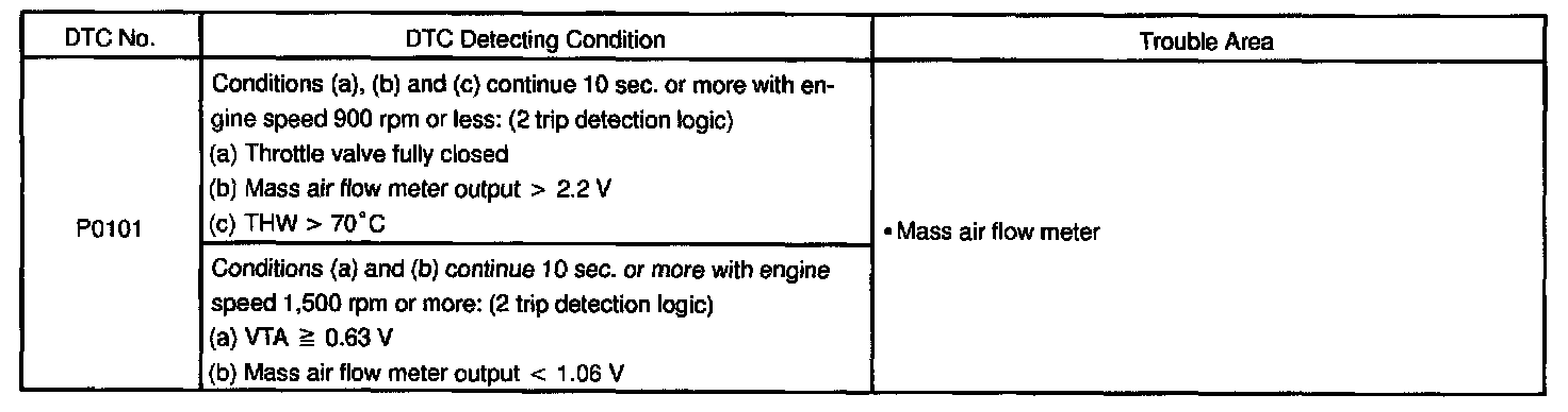 If the ECM detects DTC P0100 it operates the fail-safe function, keeping the ignition timing and injection volume constantly and making it possible to drive the vehicle.