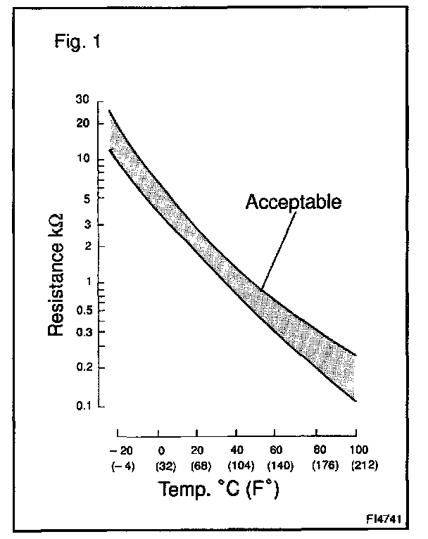 The lower the intake air temperature, the greater the thermistor resistance value, and the higher the intake air temperature, the lower the thermistor resistance value (See Fig. 1).