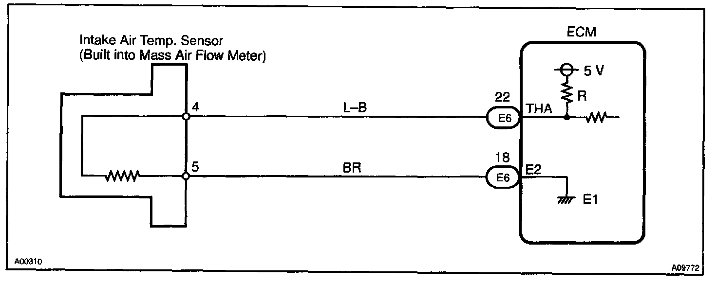 The intake air temperature sensor is connected to the ECM. The 5 V power source voltage in the ECM is applied to the intake air temperature sensor from terminal THA via resistor R. That is, resistor R and the intake air temperature sensor are connected in series. When the resistance value of the intake air temperature sensor changes in accordance with changes in the intake air temperature, the potential at terminal THA also changes. Based on this signal, the ECM increases the fuel injection volume to improve driveability during cold engine operation.