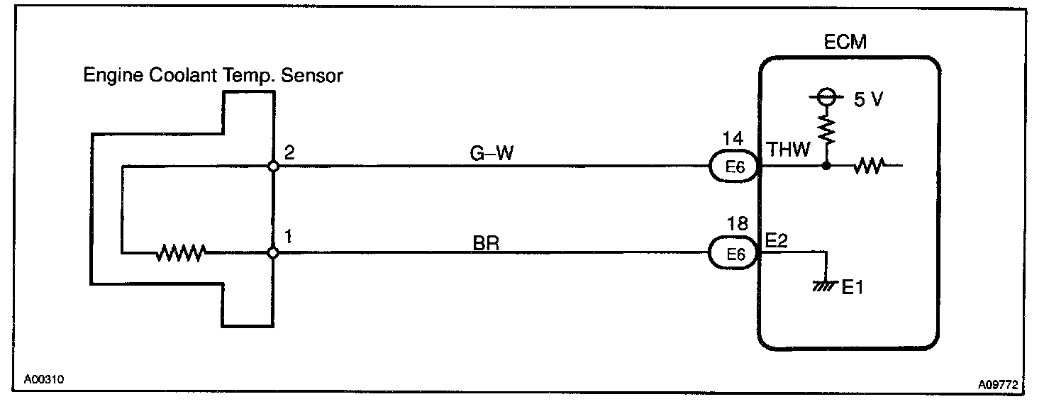 A thermistor built into the engine coolant temperature sensor changes the resistance value according to the engine coolant temperature.