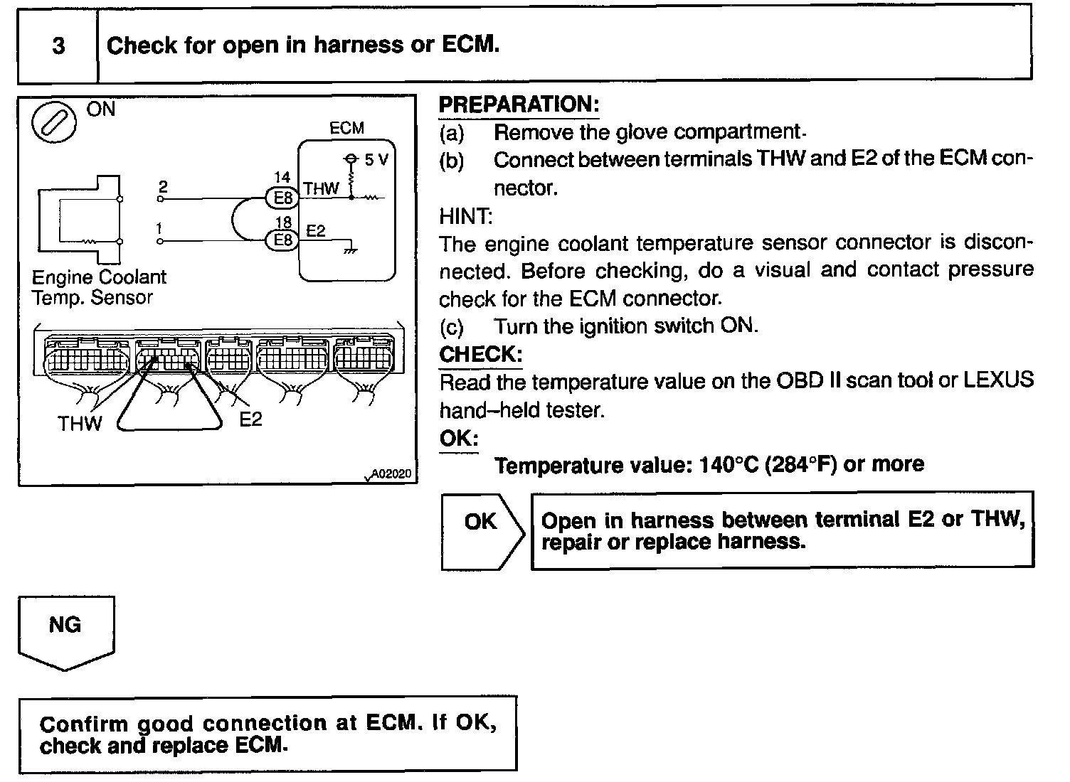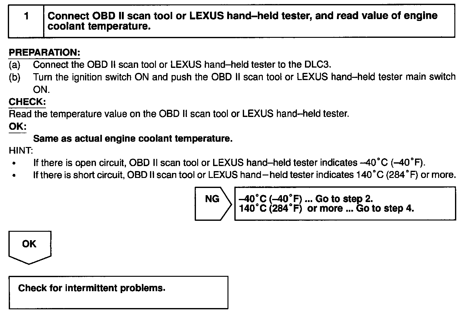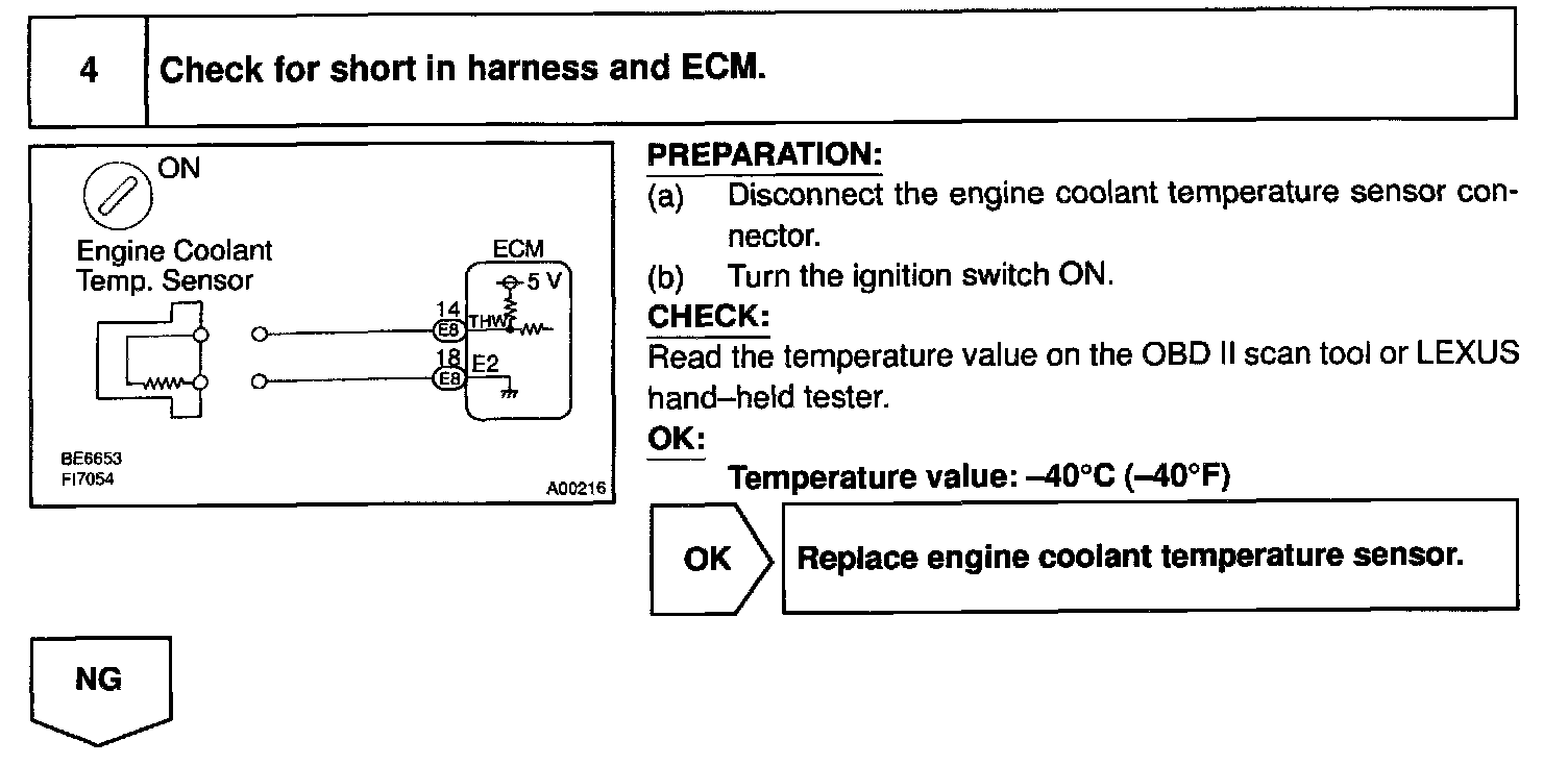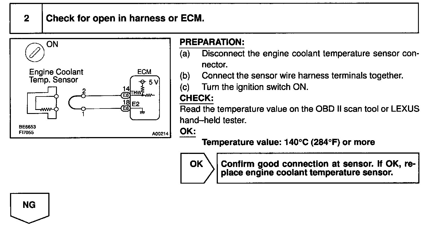 HINT: After confirming DTC P0115, use the OBD II scan tool or LEXUS hand-held tester to confirm the engine coolant temperature from CURRENT DATA.