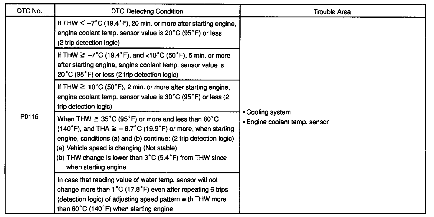 - If DTCs P0115 and P0116 are output simultaneously, engine coolant temperature sensor circuit may be open. Perform troubleshooting of DTC P0115 first.