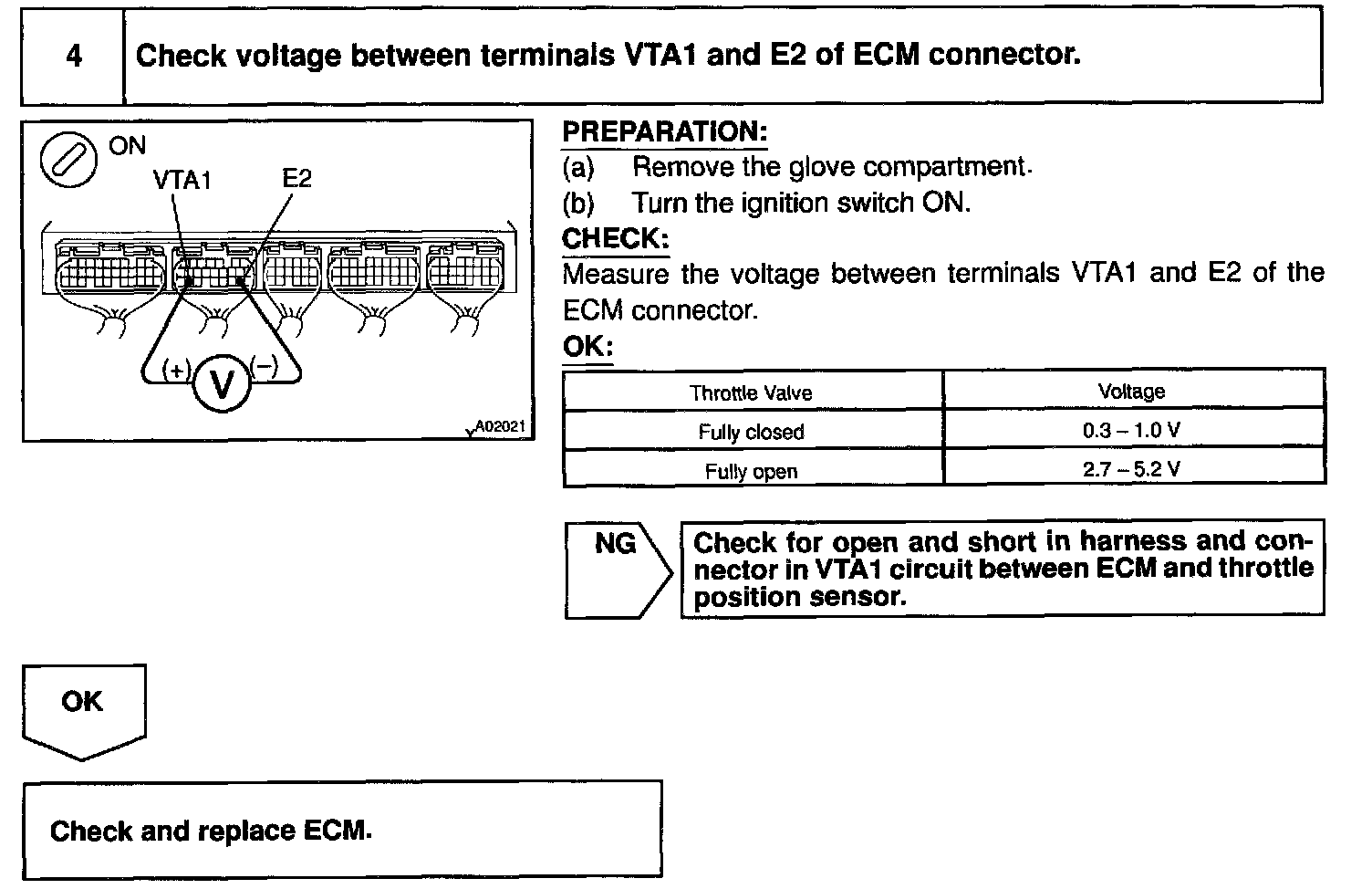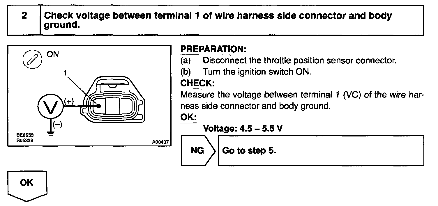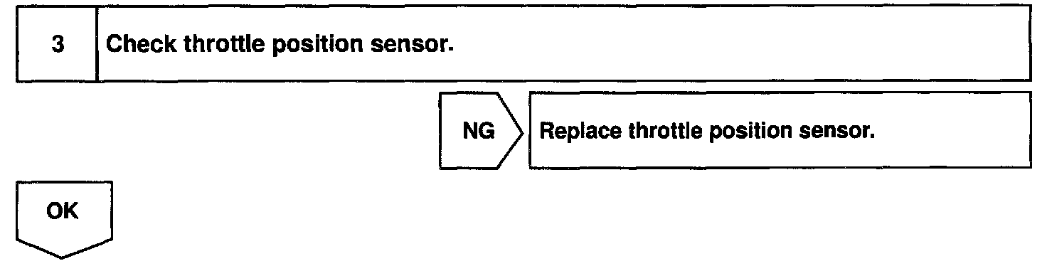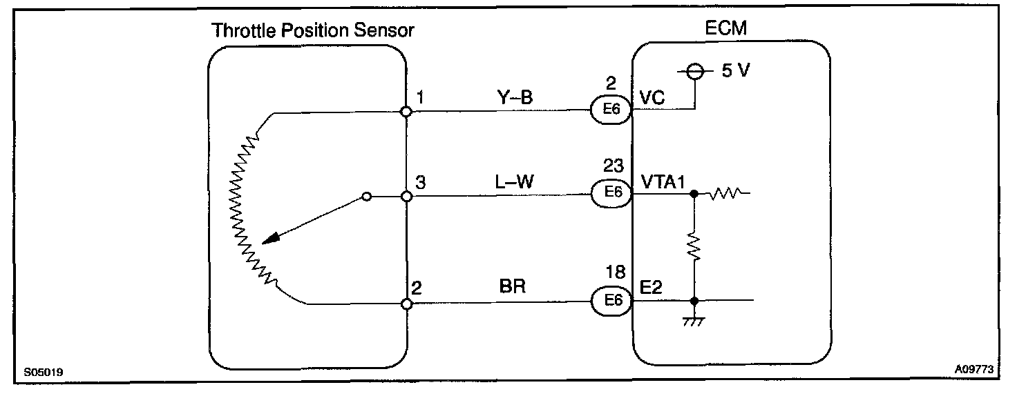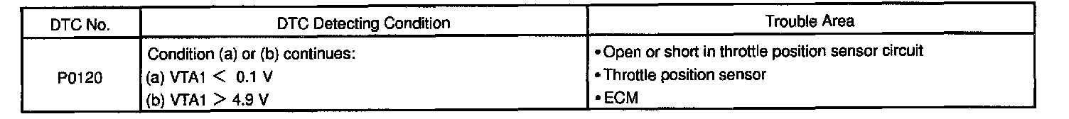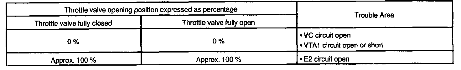 The throttle position sensor is mounted in the throttle body and detects the throttle valve opening angle. When the throttle valve is fully closed, a voltage of approximately 0.7 V is applied to terminal VTA1 of the ECM. The voltage applied to the terminals VTA1 of the ECM increases in proportion to the opening angle of the throttle valve and becomes approximately 2.7 - 5.2 V when the throttle valve is fully opened. The ECM judges the vehicle driving conditions from these signals input from terminal VTA1 and uses them as one of the conditions for deciding the air-fuel ratio correction, power increase correction and fuel-cut control etc.