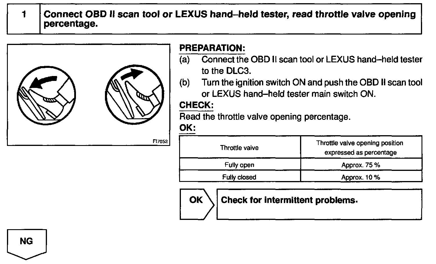 HINT: After confirming DTC P0120, use the OBD II scan tool or LEXUS hand-held tester to confirm the throttle valve opening percentage and closed throttle position switch condition.