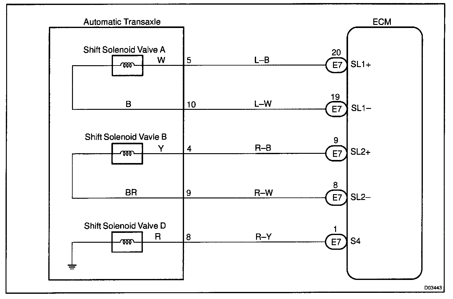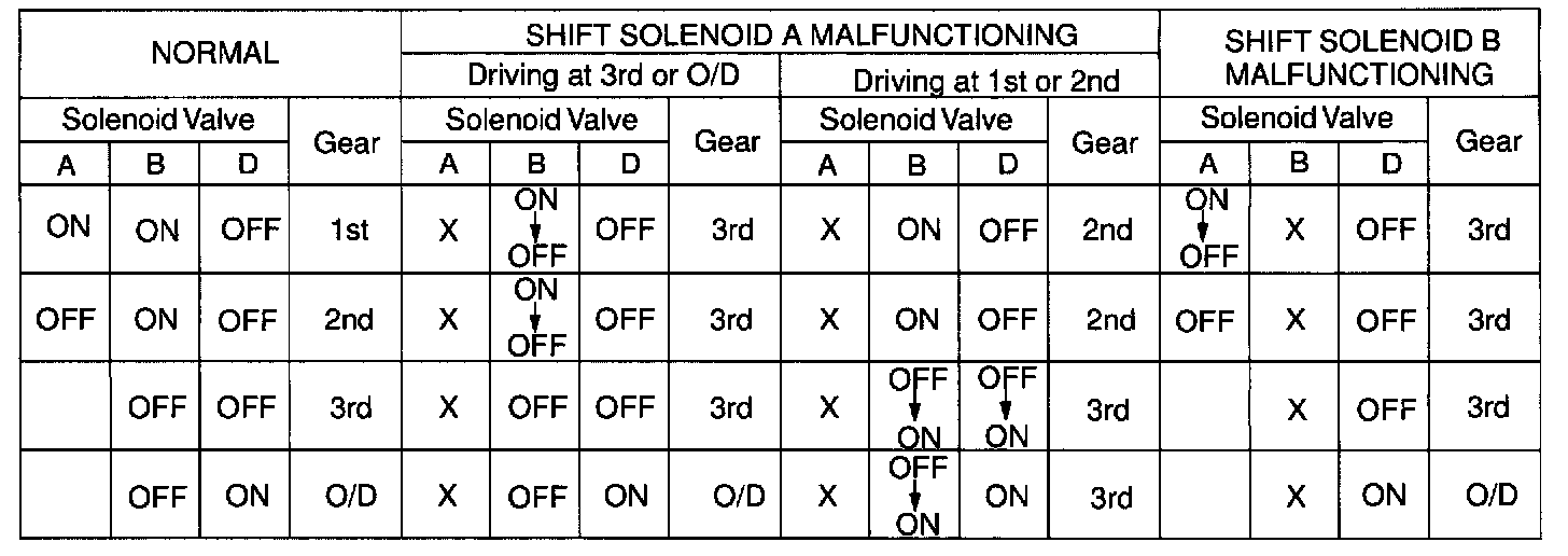 If either of the shift solenoid valve circuits develops an open or short, the ECM turns the other shift solenoid ON and OFF to shift to the gear positions shown in the table. The ECM also turns the shift solenoid valve SL OFF at the same time. if both solenoids are malfunction, hydraulic control cannot be performed electronically and must be done manually.