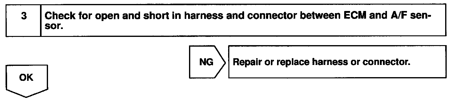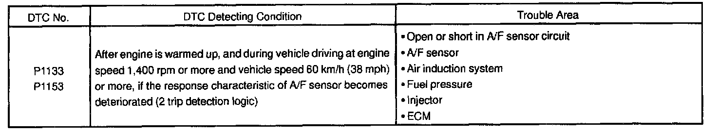 By the A/F sensor output, the ECM can determine the deviation amount from the stoichiometric air-fuel ratio and control the proper injection time immediately. If the A/F sensor is malfunctioning, ECM is unable to perform accurate air-fuel ratio control.