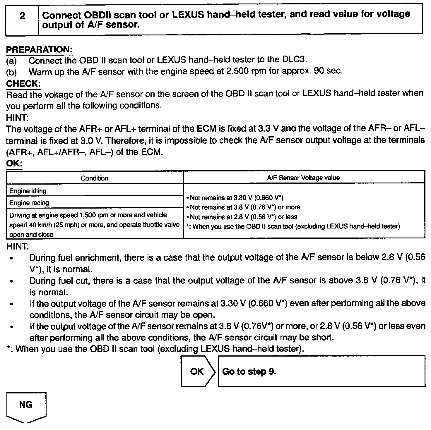 HINT: Read freeze frame data using LEXUS hand-held tester or OBD II scan tool. Because freeze frame records the engine conditions when the malfunction is detected. When troubleshooting, it is useful for determining whether the vehicle was running or stopped, the engine was warmed up or not, the air-fuel ratio was lean or rich, etc. at the time of the malfunction.