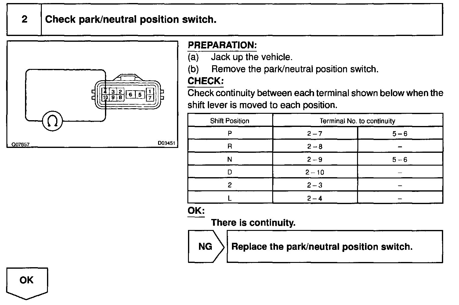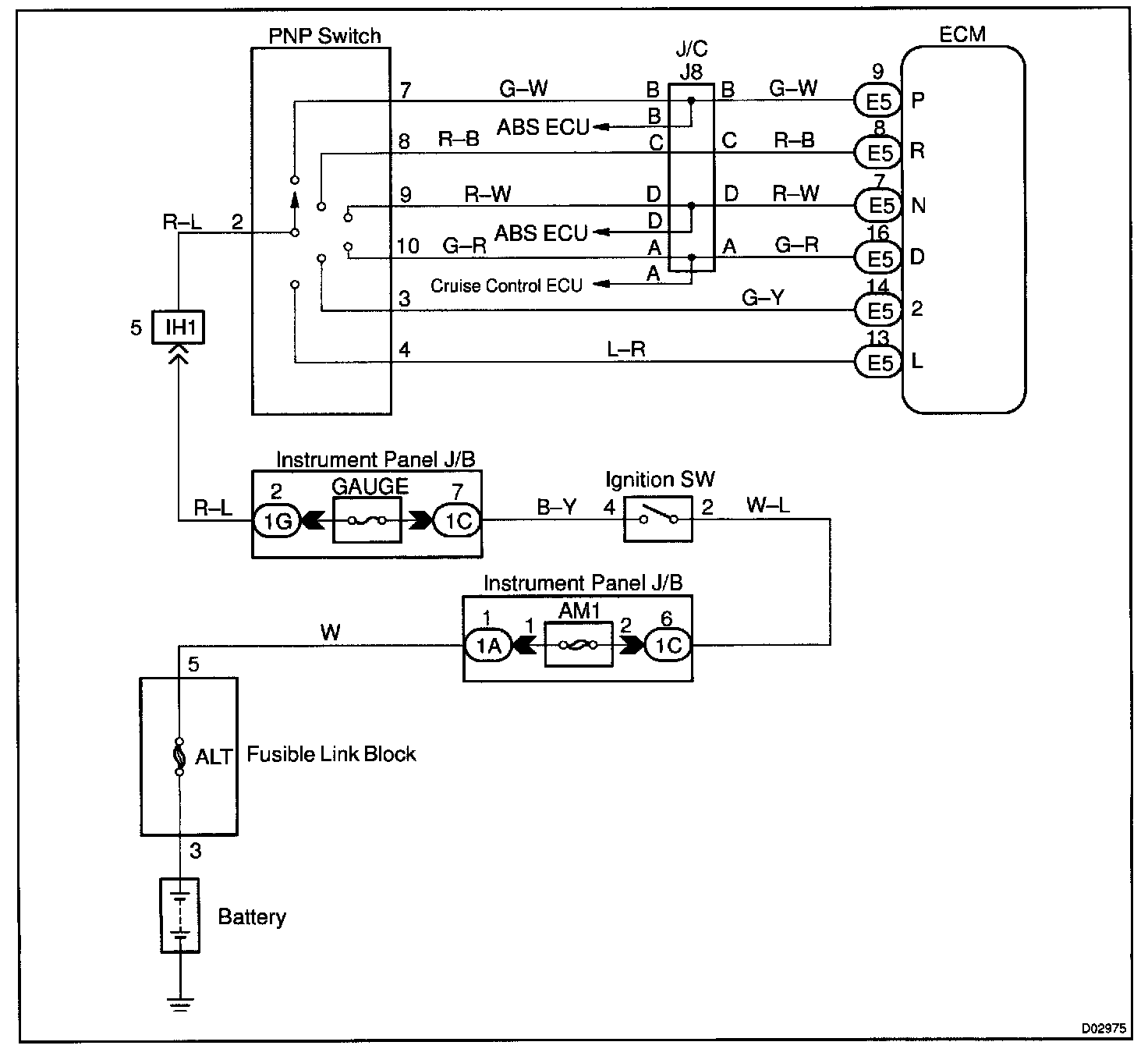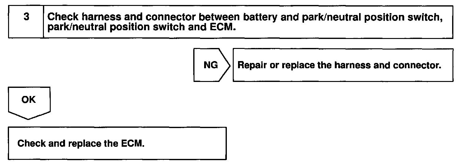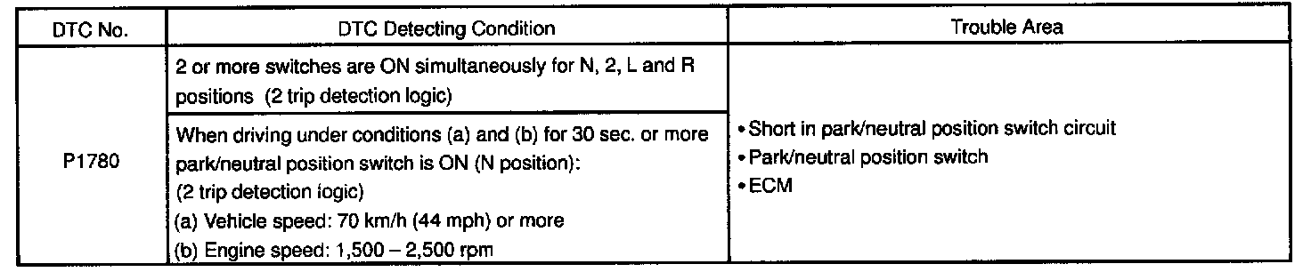 CIRCUIT DESCRIPTIONThe park/neutral position switch go on when the shift lever is in the N or P shift position. When it goes on terminal NSW of the ECM is grounded to body ground via the starter relay, thus the terminal NSW voltage becomes 0 V. When the shift lever is in the D, 2, L or R position, the park/neutral position switch goes off, so the voltage of ECM. Terminal NSW becomes battery voltage, the voltage of the ECM internal power source. If the shift lever is moved from the N position to the D position, this signal is used for air-fuel ratio correction and for idle speed control (estimated control), etc.
