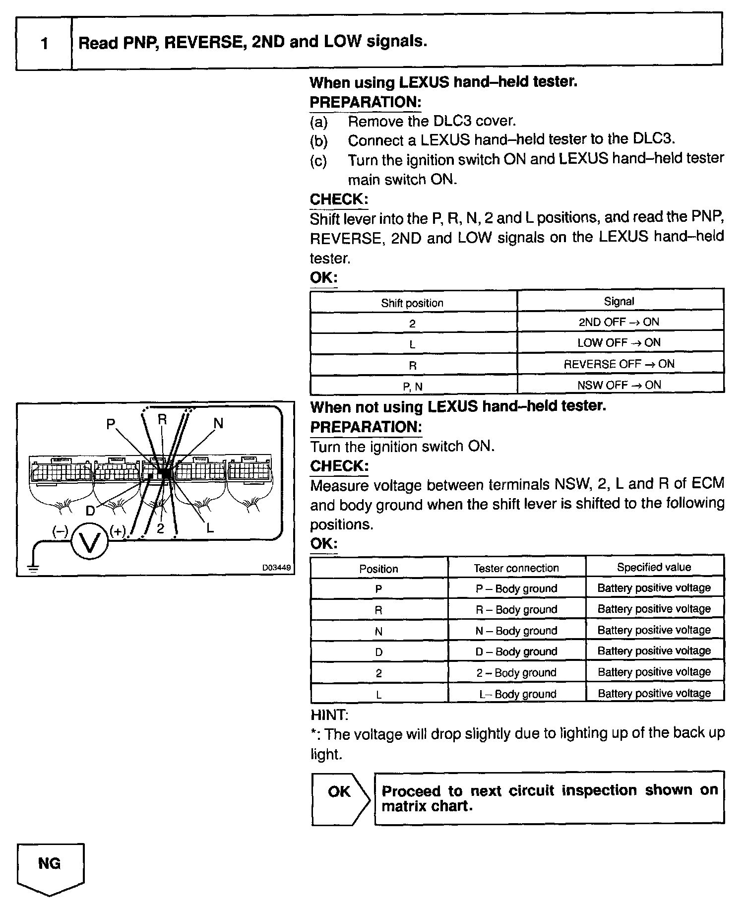 HINT: After confirming DTC P1780, use the LEXUS hand-held tester to confirm the PNP switch signal from the CURRENT DATA.