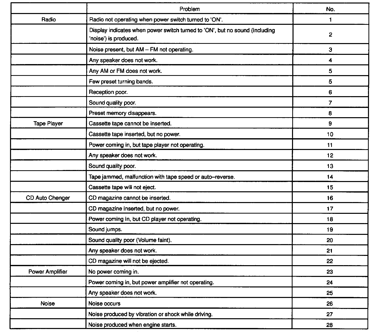NOTE: When replacing the internal mechanism (computer part) of the audio system, be careful that no part of your body or clothing comes in contact with the terminals of the leads from the IC, etc. of the replacement part (spare part).HINT: This inspection procedure is a simple troubleshooting which should be carried out on the vehicle during system operation and was prepared on the assumption of system component troubles (except for the wires and connectors, etc.).
