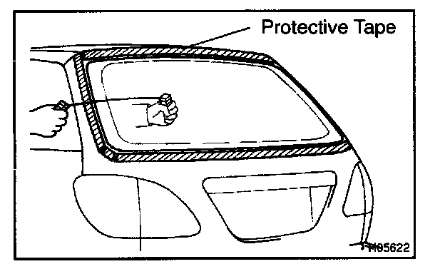 d. Hold the windshield glass in place securely with a protective tape or equivalent until the adhesive hardens.