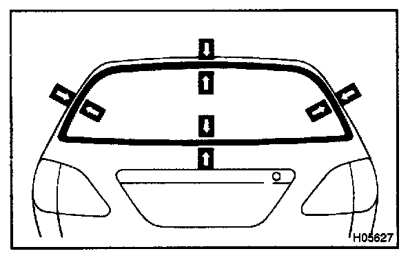 - Install the back window outside moulding from the center of the glass at the upper side of the vehicle. (Position B)