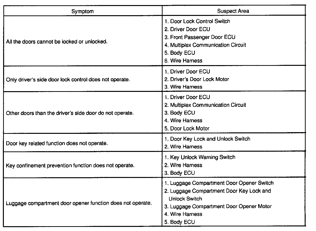 The table will be useful for you in troubleshooting these electrical problems. The most likely causes of the malfunction are shown in the order of their probability. Inspect each part in the order shown, and replace the part when it is found to be faulty.This system uses the multiplex communication system so check diagnosis system of the multiplex communication system before you proceed with troubleshooting.