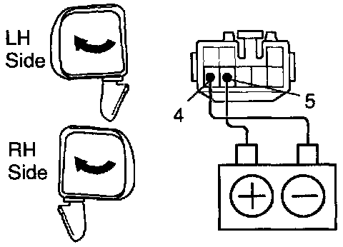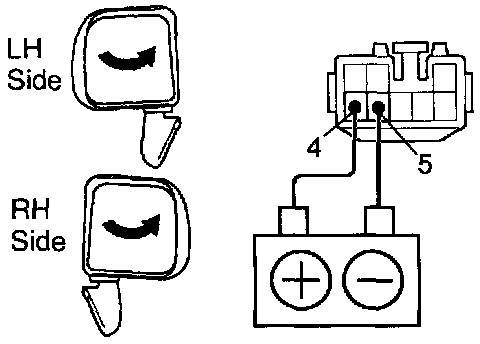 INSPECT MIRROR MOTOR OPERATIONa. Connect the positive (+) lead from the battery to terminal 5 and negative (-) lead to terminal 4, check that the mirror turns to left side.