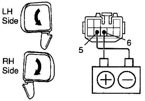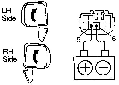 c. Connect the positive (+) lead from the battery to terminal 5 and the negative (-) lead to terminal 6, check that the mirror turns upward.