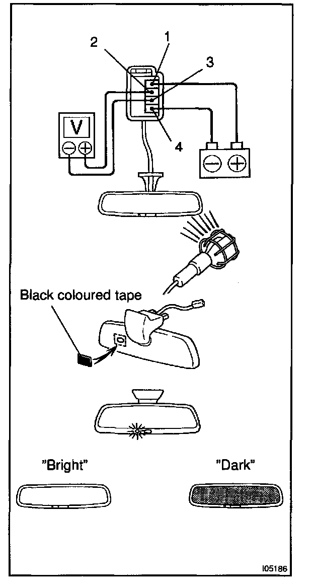 e. Light up the mirror with an electric light, and check that there is battery positive voltage and mirror surface changes "bright" to "dark".