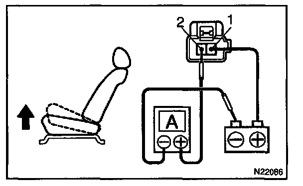 a. Connect the positive (+) lead from the battery to terminal 2, the positive (+) lead from the ammeter to terminal 1 and the negative (-) lead to the battery negative (-) terminal, then recline the seat back to the most forward position.
